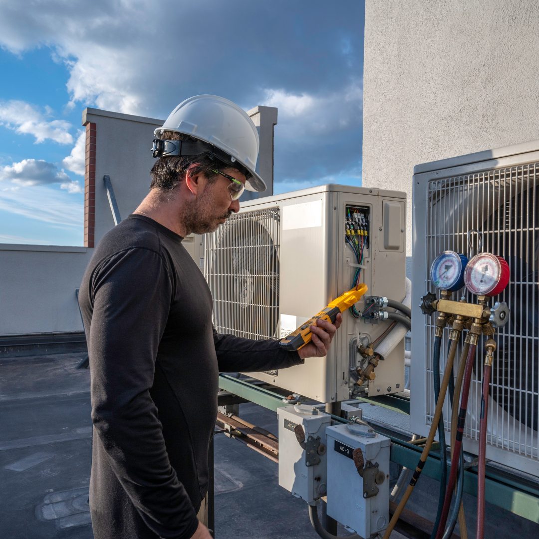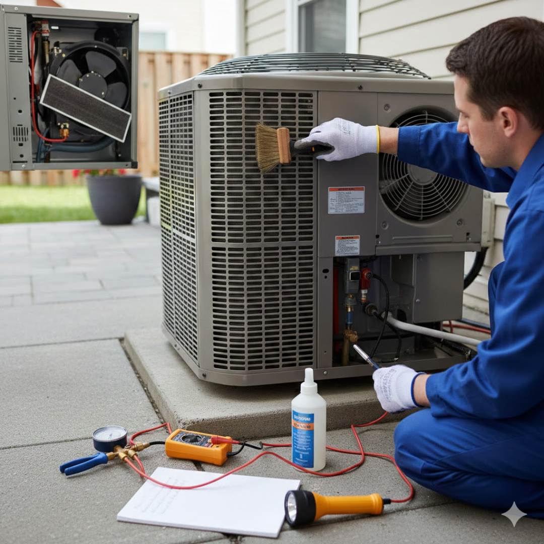 Homeowners can handle basic tasks like changing air filters and clearing debris from around the outdoor unit. However, technical tasks like checking refrigerant pressures, cleaning internal coils, and testing electrical components should be left to the pros.